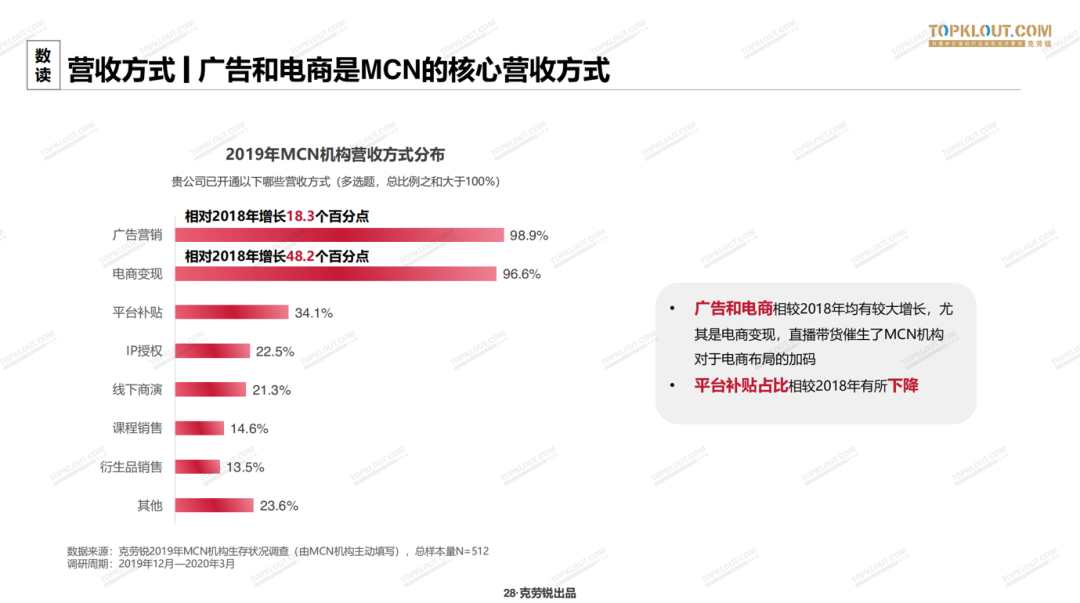 根据白皮书,尽管在2019年广告依然是核心收入,但是电商直播的收入,无论是增速还是增量,都远远超过广告。这也导致了各大MCN的商业布局中,有40.2%的机构选择在2020年,将重点布局在电商直播领域。