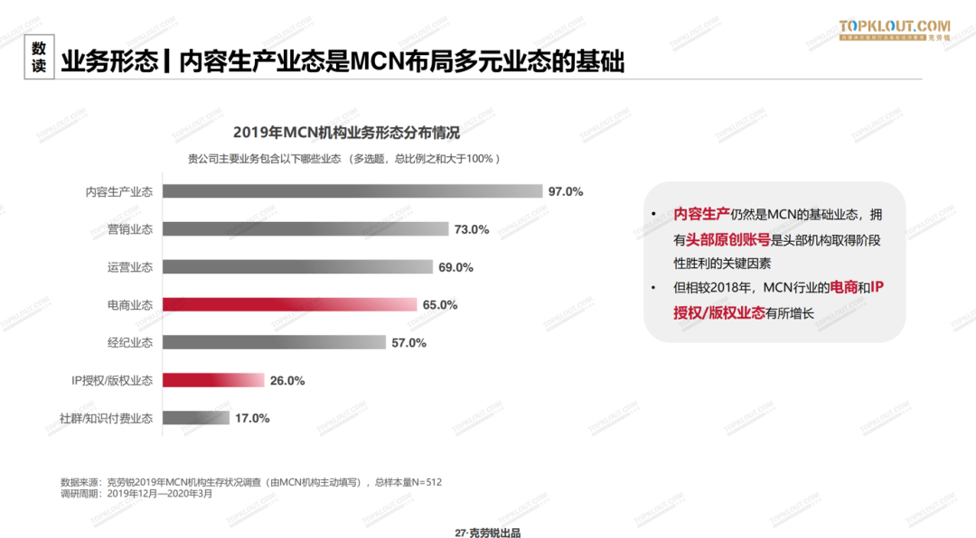 这个小细节说明了,平台的红利正在消失,MCN也意识到了这一点,开始着重于布局多元业态。在白皮书中可以看到,内容生产依然是MCN的基础业态,是一切多元业态的根本。但同时也会发现,MCN在电商和IP授权/版权业态的布局上,也有所增长。