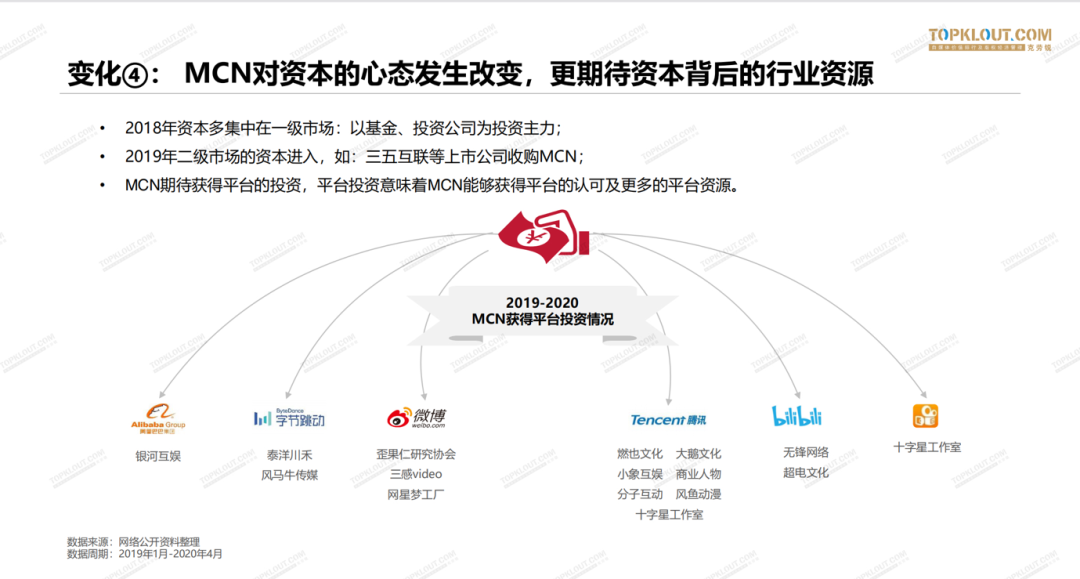 随着市场规模的扩大,资本市场和MCN之间的关系也有了微妙的转变。“网红概念”成为了股市的热门概念,二级市场逐渐加入,不少上市公司如三五互联、万达电影等,均涉及MCN机构的收购。此外,平台也更愿意寻找优质MCN机构进行投资。