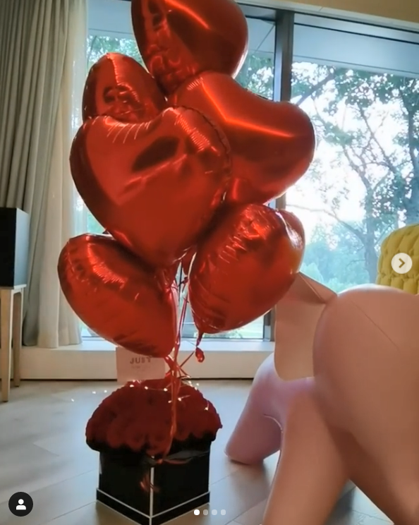 艾伦送给陈乔恩的礼物不是一个,而是一系列礼物,有浪漫的气球和玩偶、大礼盒,也有手提小礼袋,她放在手中,看外形似乎是戒指,或者是手链之类的配饰。