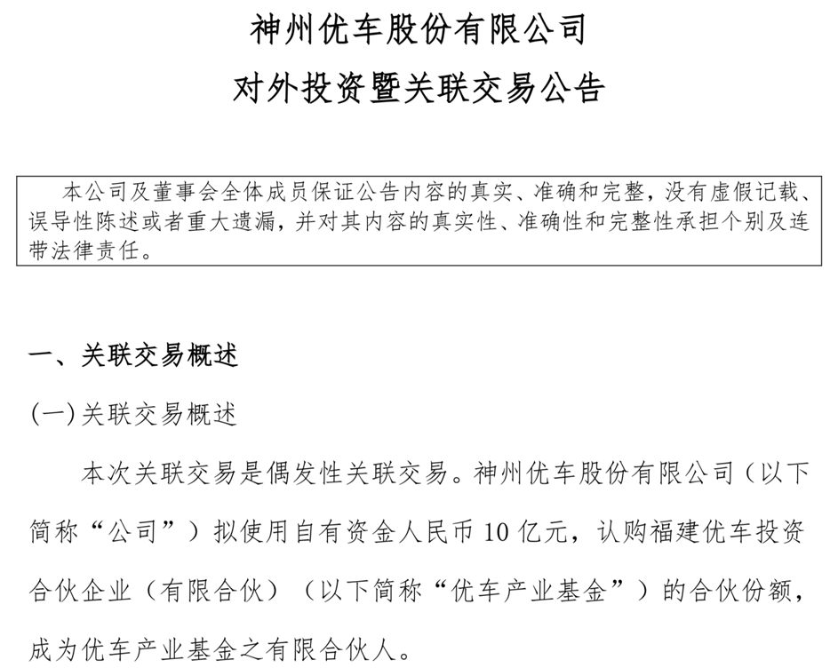 该公告同时指出,优车产业基金是专门面向汽车生态圈产业升级整合的人民币股权投资基金,主要投资方向包括汽车相关产业链纵向整合及消费模式的创新、新能源汽车及其上下游配套产业及新兴商业模式、智能驾驶及车联网相关技术及应用以及普通合伙人独立决定的相关投资领域。