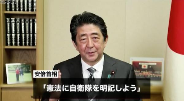 图为5月3日日本宪法纪念日的安倍视频讲话,他说:“在宪法中明确记载自卫队吧。”把自卫队写入宪法是安倍改宪的一个重点