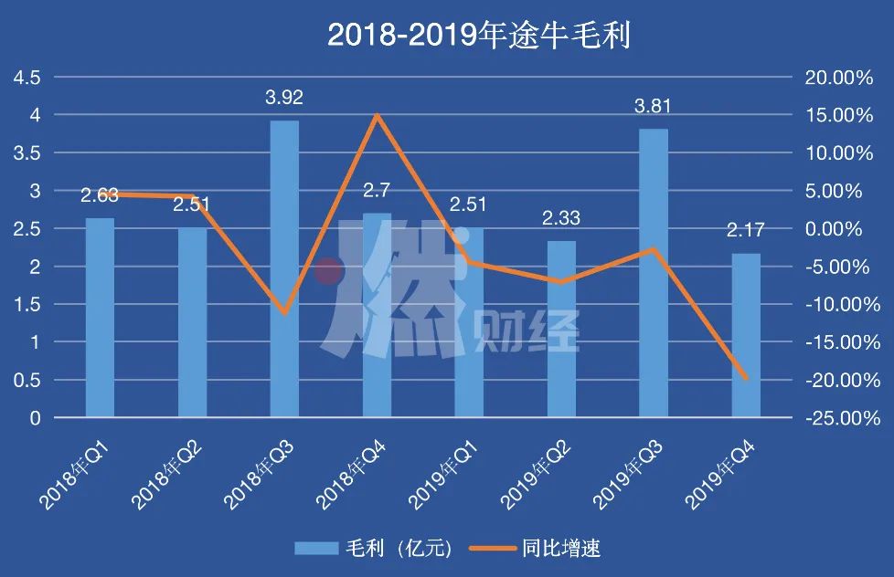 由财报可以看出,2019年四个季度途牛的毛利增速全部为负,到第四季度毛利同比大幅下滑19.8%至2.17亿元,拖累了公司的整体盈利能力。