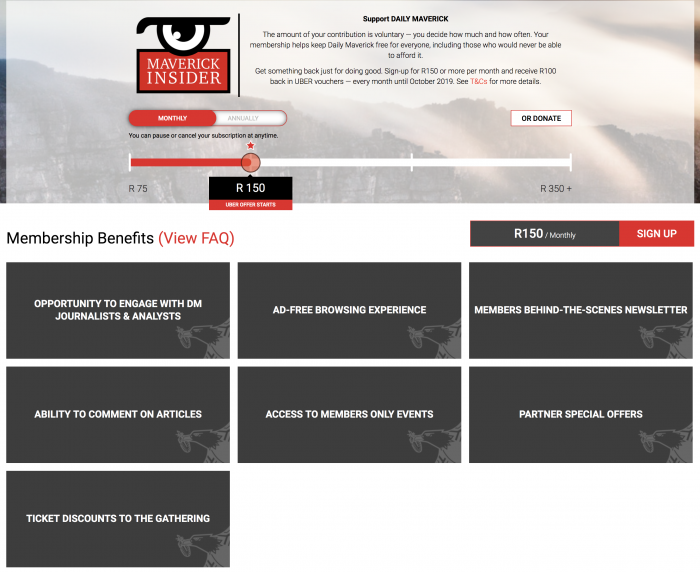 在转型过程中,Daily Maverick放弃了订阅付费模式,因为南非的经济形势不容乐观,相当一部分读者无力支付订阅费用,如果只依靠富裕的读者付费,网站将面临更为严峻的形势。在Membership Puzzle Project(纽约大学的一个公共研究项目,致力于资助和引导想推出会员计划的新闻机构)的帮助下,网站开始尝试会员项目,其目标是让所有用户能够免费获取高质量的新闻和调查,同时继续发挥社会监督的职能。