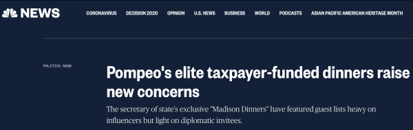 蓬佩奥主持这些晚宴的方式引发了多方面的担忧,例如使用纳税人的资金。据NBC报道,晚宴的花费由国务院的突发事件外交和领事服务拨款支付,现任和前任国务院官员表示,为遵守拨款要求,国务院官员通常确保有相当比例的外国政要或官员出席。