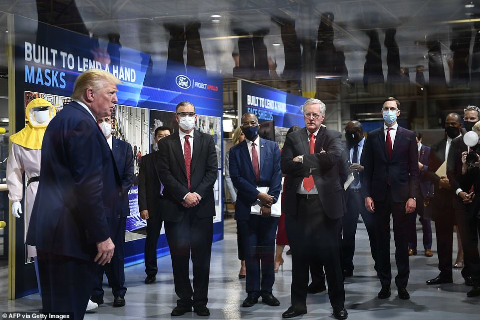 而特朗普的随性团队中,除了白宫办公厅主任马克·梅多斯(Mark Meadows)和他一样,没有佩戴外,其他人都将自己保护了起来,住房和城市发展部长本·卡森和第一女婿贾里德·库什纳,甚至还佩戴上了护目镜。据悉福特公司已经做出了让步,一位发言人称,白宫已经制定了自己的安全和检测政策,特朗普在参观时是否戴口罩,由他自己决定。
