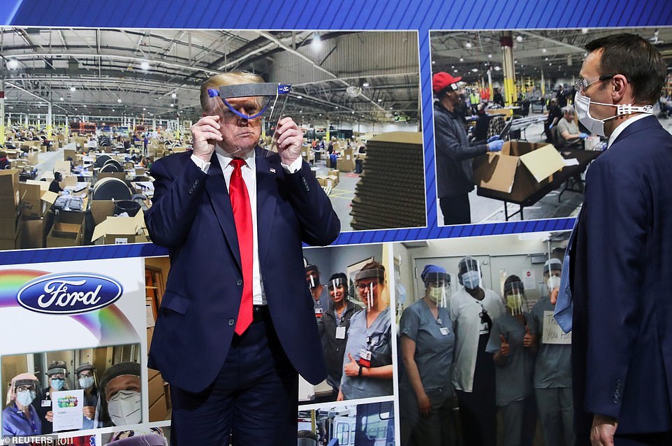 在非常时期,福特公司也不完全生产汽车了,而是改为生产呼吸机和个人防护装备,特朗普也在参观时拿起了一个防护面罩,不过他并没有想要戴上,难道是怕破坏发型?