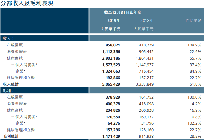 到2019年,家庭医生板块营收占比16.94%,健康商城营收占比57.29%、消费型医疗业务占到21.96%。