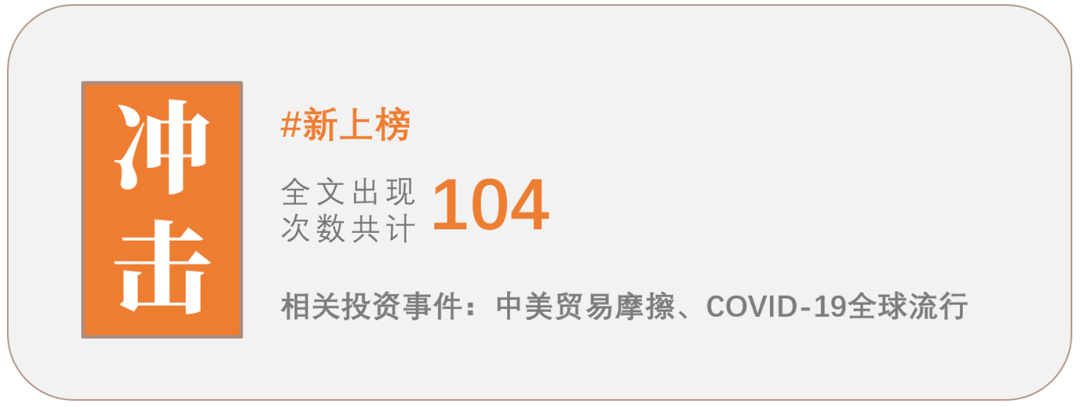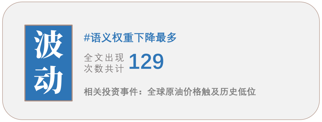 “波动”一词出现129次,与中报相比次数虽有增加,但权重影响被“疫情”等词抢了风头。其中,“国际油价波动”位列榜首,采掘、能源、化工、有色、电子、交运等行业的龙头公司纷纷对“国际油价波动“发出预警。