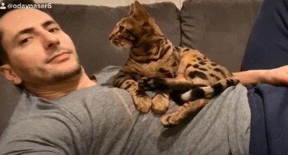影片中,主人躺在沙发上,而豹猫则趴坐在胸膛上,深情款款地望着奴才,没几秒喵星人像突然没骨头似的,整只赖倒在主人怀中撒娇,还微微眯起眼睛,看起来就像个小女朋友,也难怪奴才的表情会如此自豪了。