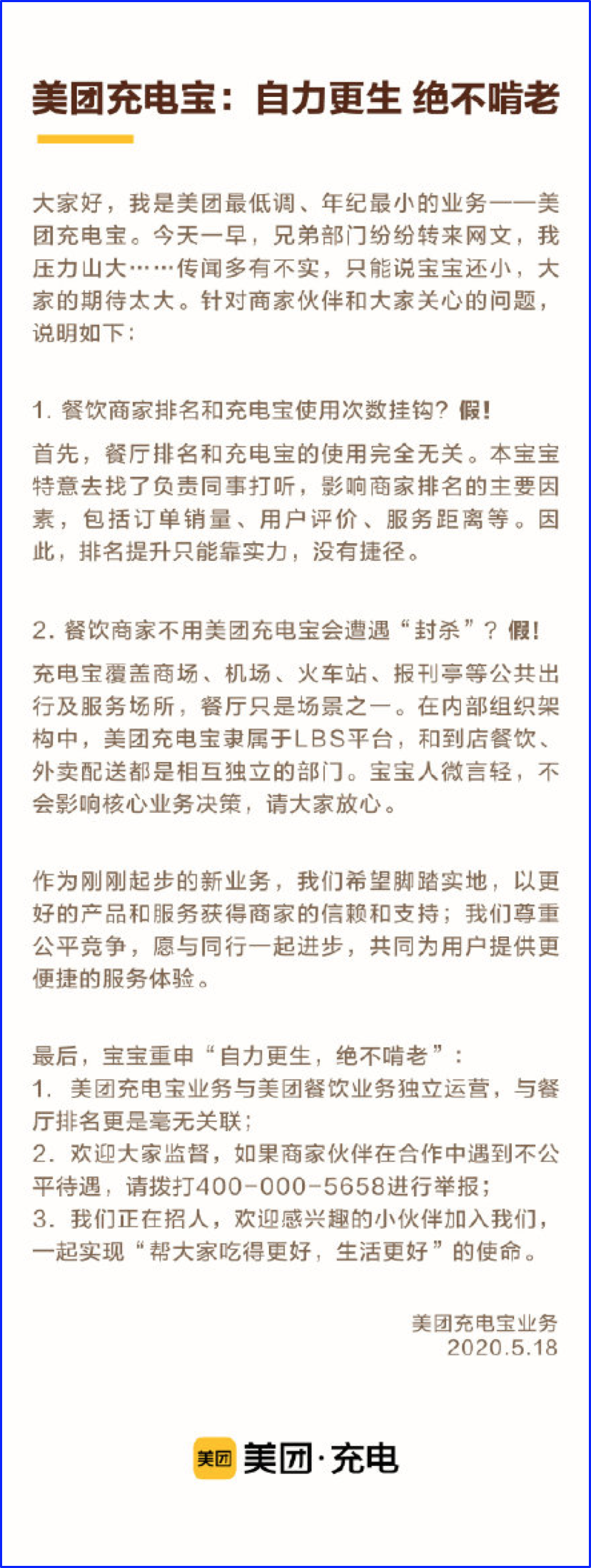 美团否认充电宝与餐厅排名关联