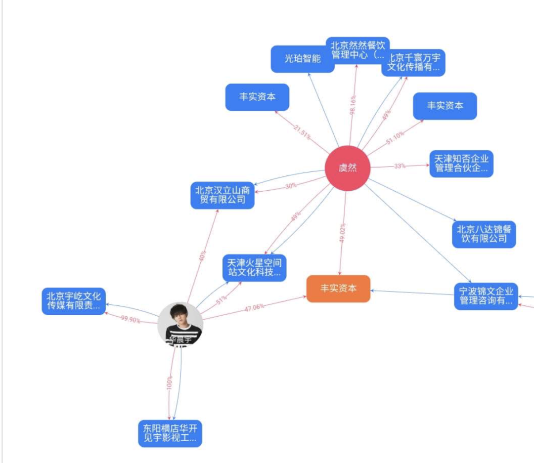而上图另一家公司"天津火星空间站文化科技有限公司"则是华晨宇公布的"火星空间站MARS"微信公众号背后的主体公司。此外,在2019年3月,虞然与华晨宇的另一位合作伙伴卢川又在北京成立了"千寰万宇文化传媒有限公司"。而虞然也有着深厚的资本背景,不仅自己拥有多家餐饮公司,还参股了多家投资基金和上市公司。