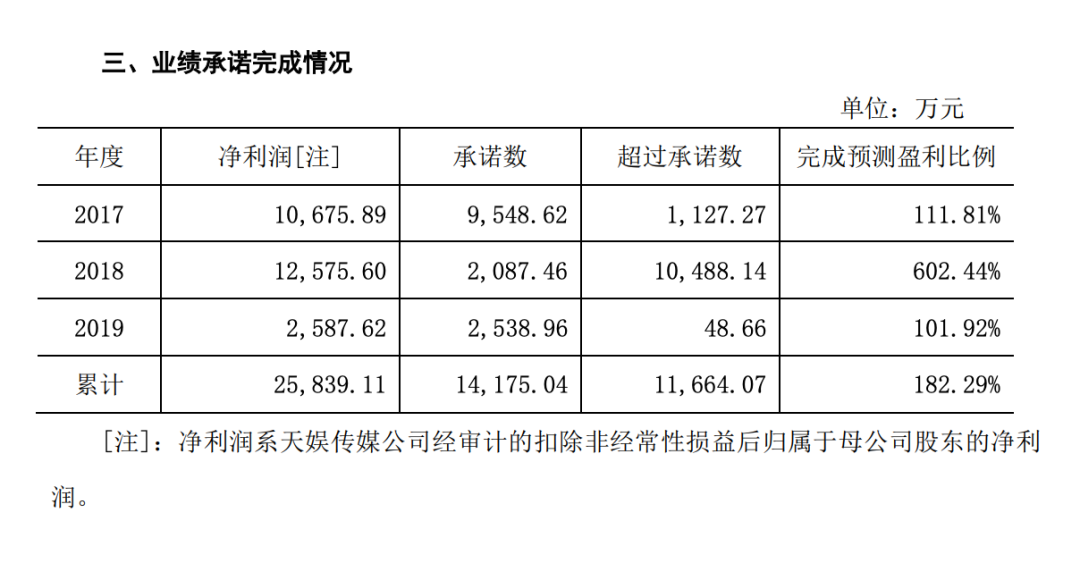 上个月底,华晨宇所属公司天娱传媒的母公司"芒果超媒"发布了2019年度财报。财报显示,2017、2018两年,天娱传媒的净利润都超过了一亿元,2019年仅有2500多万元。在经历并购两年的高光时刻后,2019年天娱的净利润出现断崖式下跌,不过好在完成了对赌承诺的业绩。