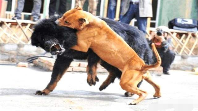 打不过也会竭尽全力,和比特犬有许多相似之处。比赛刚一开始,日本土佐就一个猛扑上去,咬住藏獒的脸,但是此时的藏獒好像还没睡醒,体内并没有燃烧起熊熊的战斗欲望,而主人在后面不停拍打着藏獒,似乎在底下加油鼓气。