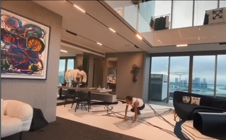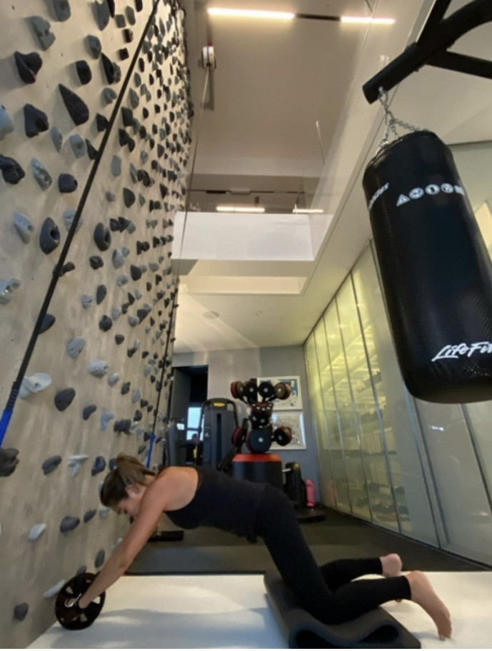 不仅如此,她还在家中建了一个两米高的室内攀岩墙,一看就非常高大上。至于室外瑜伽设施、泳池、桑拿房更是应有尽有。