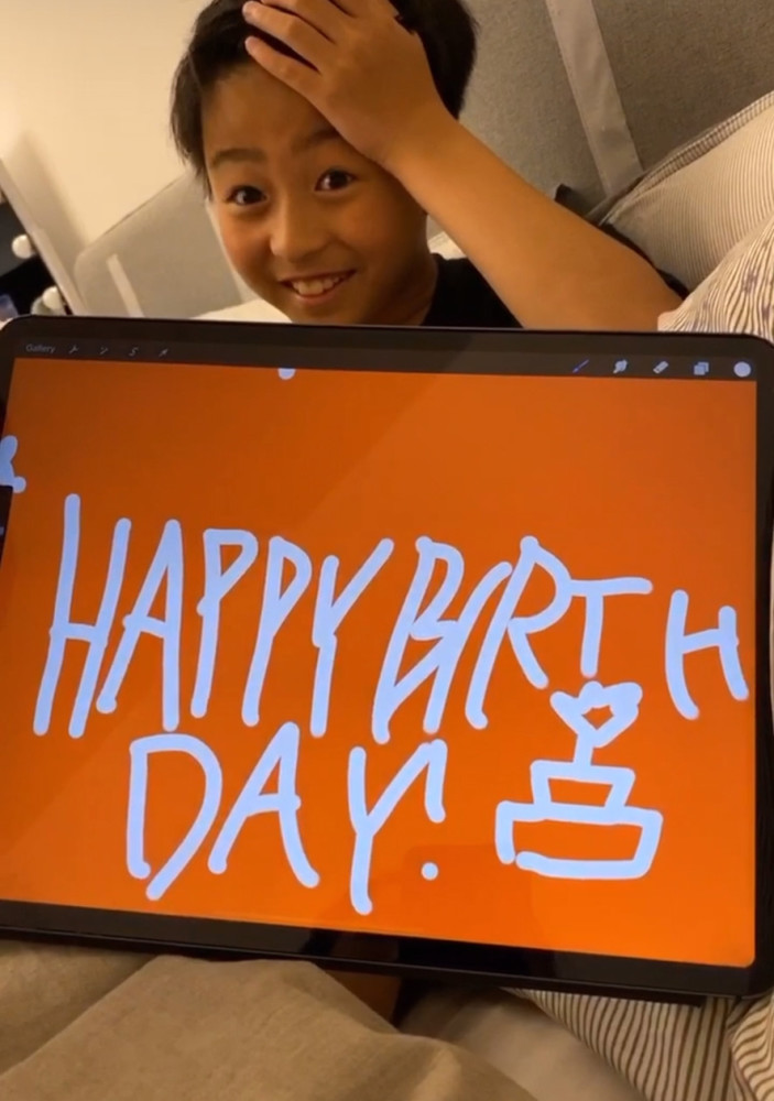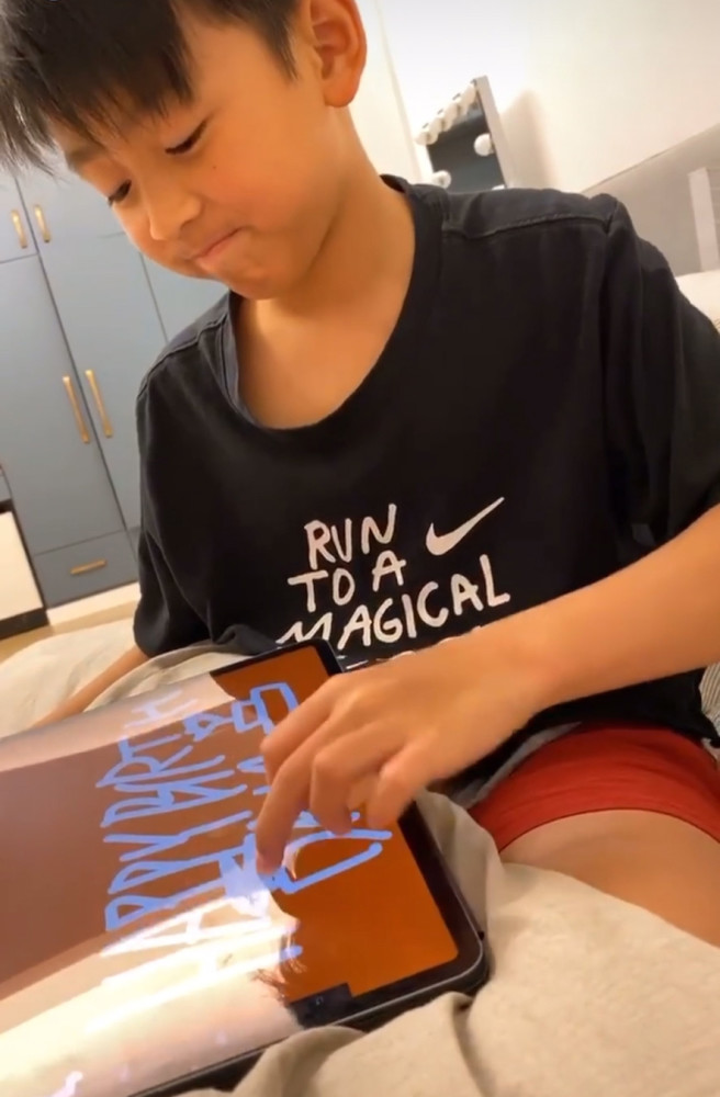 相对于哥哥而言,刚满10岁的次子Quintus就比较open,喜欢和妈妈一起拍有趣的短片。这次,他为妈妈准备的礼物则是在平板上手写的生日祝福,背景选择柏芝最爱的橙色,心思十分巧妙。