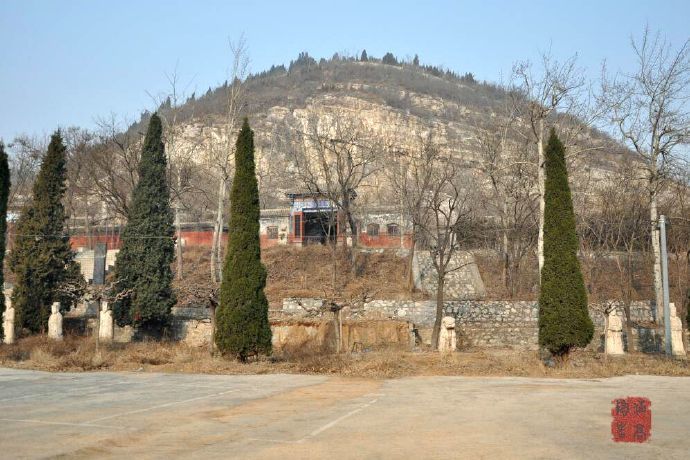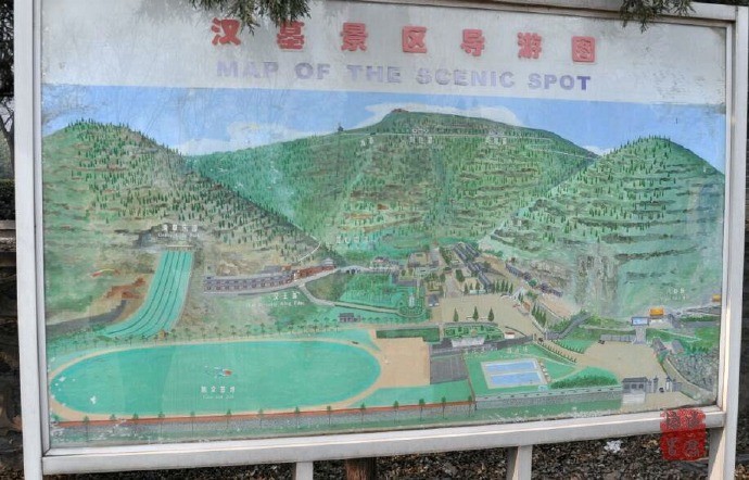在山梁东侧,一南一北各有一个山包,山梁高二百多米,两个山包形状类似高不足二百米。正像是一把面东而放的宝座,历代中山靖王墓皆在定州一带,刘胜之所以选墓在此,也可见该地的风水是极好的。笔者从北侧山包上山,山虽然不高,但是山坡缓、山路长,又是在浓重的雾霾天里,便觉身体不适。如此一直坚持到山顶,总算是到了刘胜、窦绾二人的墓室洞口。这两座墓基本位于这道山梁的对折线上,山梁之上最高处还有一座新建的寺庙名曰普度寺,修造的略显简陋。再沿南侧山包下山,一路上有数十座竖坑式陪葬墓,遗憾的是早经破坏,笔者并未得见之一。陵山山下,如今还有一些新建景观,有道观、寺庙等,皆要收取门票坑骗游客。