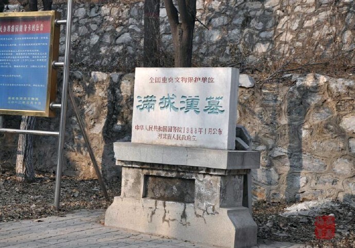 满城汉墓是西汉武帝时期中山靖王刘胜和其妃窦绾的同茔异穴合葬墓,在其墓葬南侧山腰还有数十座陪葬墓。西汉前期盛行凿山为穴的营建陵墓方式,比如徐州的诸座西汉楚王墓,永城的梁孝王墓等。凿山为穴建造陵墓工程十分巨大,也只能盛行于汉唐盛世。另外,上述墓葬基本开在山脚下,但是满城的汉墓却在山腰接近山顶的位置。满城汉墓一直有“第一崖墓”的美誉,“崖”即山崖、悬崖。笔者一直不知道中山靖王的这个墓竟然建在了山顶。而其墓所在的陵山,位于满城西南,山坐西面东,有三座相连的山峰,造型十分奇特。陵墓所在的后山是一道平直的横亘山梁,南北走势。