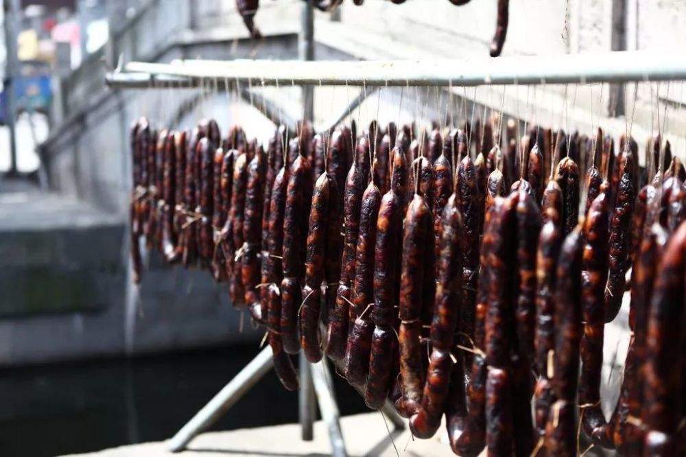 安昌的腊肠和酱油远近闻名,挂在竹架子上密密麻麻的腊肠是当地特有风景。