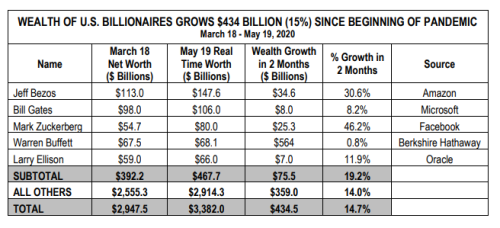 与此同时,在疫情期间,美国亿万富翁们的财富却增加了约4340亿美元,资产增长最多的当属贝索斯和扎克伯格等互联网巨头创始人。