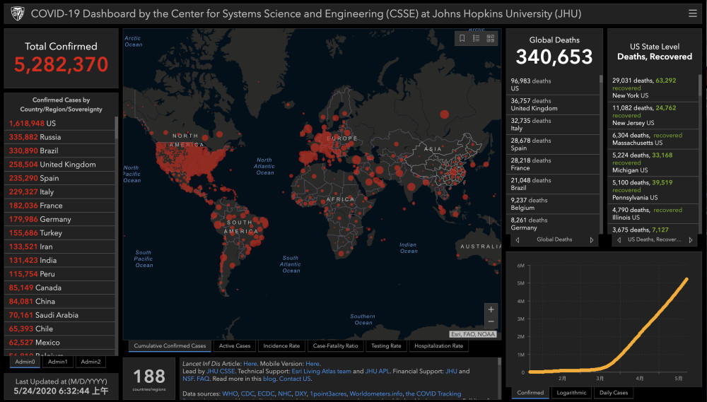 据约翰斯·霍普金斯大学的实时数据,截至北京时间5月24日6时32分,全球新冠肺炎累计确诊病例超528万例,累计死亡病例超34万例。