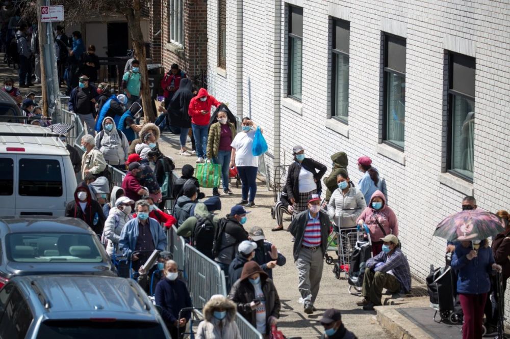在美国纽约一个食品发放点,人们排队等待领取慈善组织发放的免费食品。新华社图