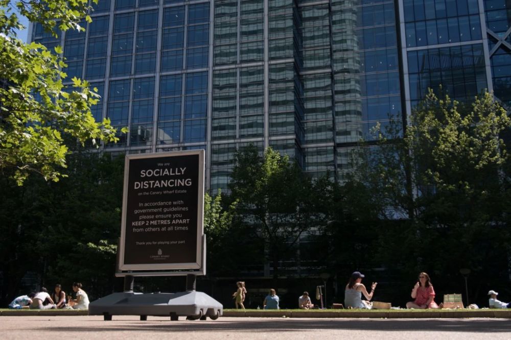 英国伦敦金丝雀码头新金融城一处公园内竖着“保持社交距离”警示牌。新华社图