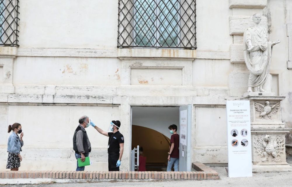 在意大利首都罗马,重新开放的博尔盖塞美术博物馆工作人员给参观者测量体温。新华社图
