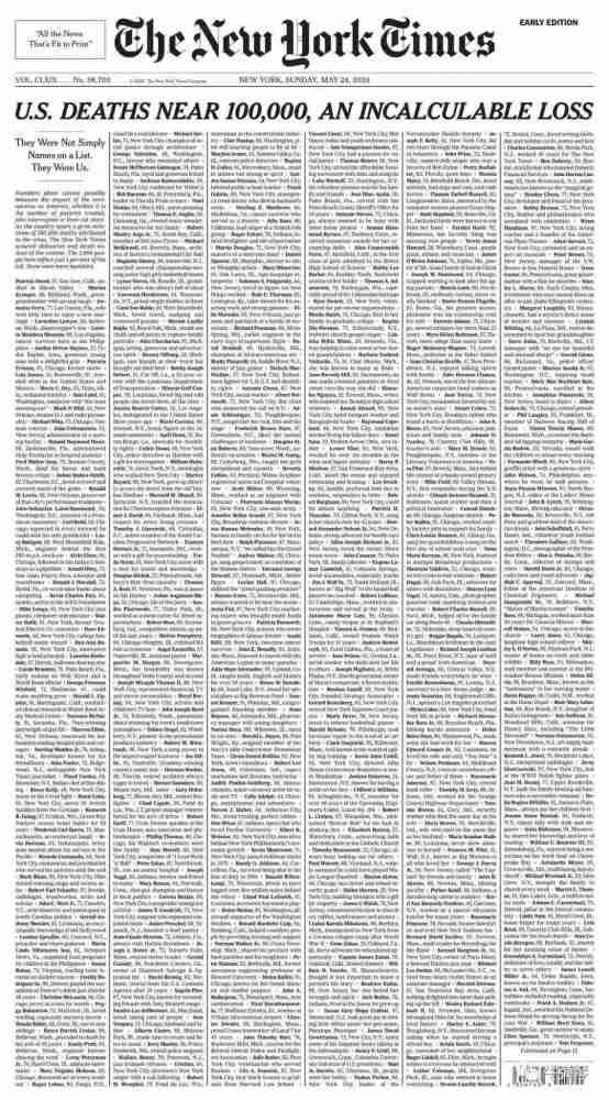 要知道,今天的纽约时报,头版非常震撼,标题是:美国死亡接近10万,无法计算的损失。然后,是密密麻麻的1000个死者信息,新闻导语是:他们不仅仅是一个个名字,他们曾经是我们……