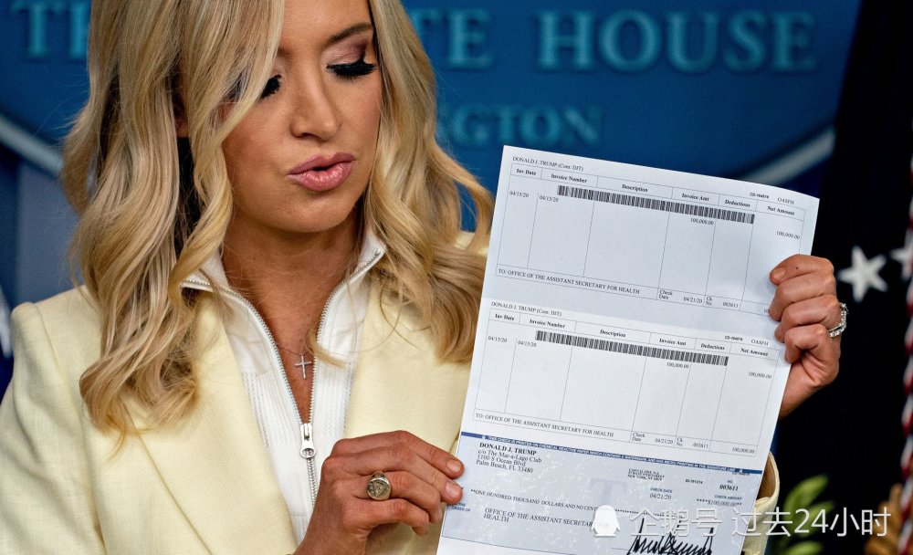 自上任以来,特朗普在每个季度都将自己的总统薪水捐出去。这件事自然成为白宫津津乐道的话题。于是,在新闻发布会上,凯利·麦肯尼举起了特朗普本季度捐款的10万美元支票。