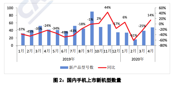 5 月 12 日,中国信息通信研究院发布了《2020年4月国内手机市场运行分析报告》,报告中称,2020 年 4 月,国内手机上市新机型 48 款,同比增长了 14.3%。1-4 月,上市新机型累计 137 款,同比下降 18.0%。