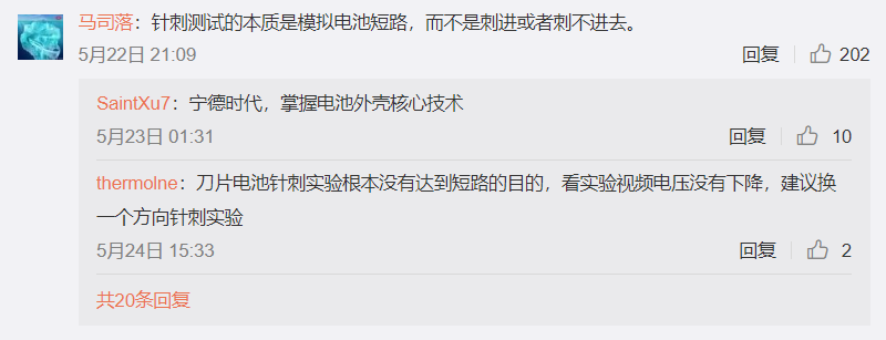 但这则视频引发网友不满。有网友在上述微博评论中指出:“针刺测试的本质是模拟电池短路,而不是能否刺入。”如果没有针刺成功,电池电压也没有下降,只能说明针刺实验没有达到目的。还有人尖锐地讽刺宁德时代“掌握电池外壳核心技术”。
