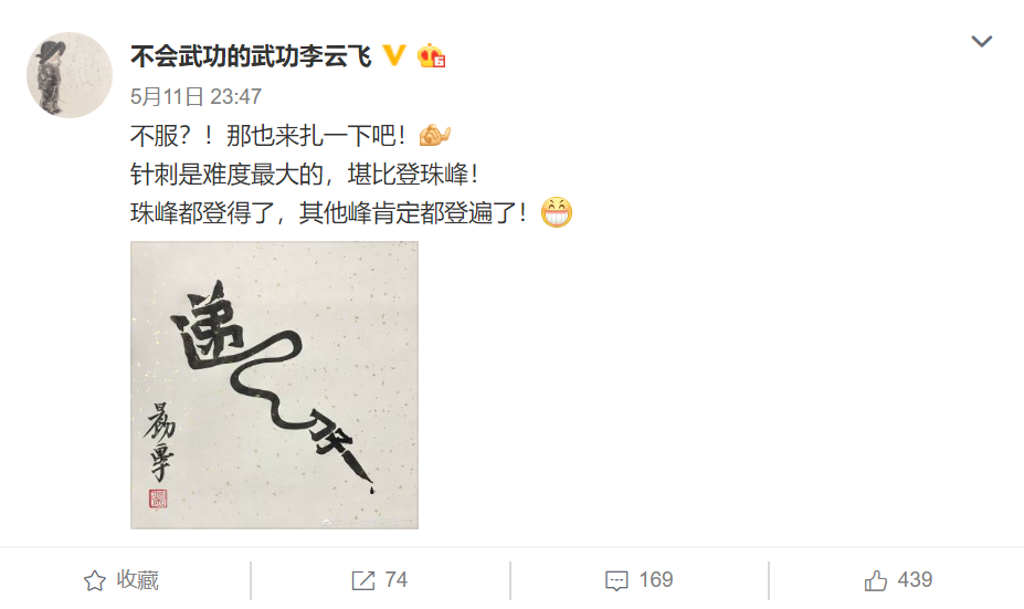 对此,比亚迪销售副总经理李云飞在微博表示:“不服?!那也来扎一下吧!针刺是难度最大的,堪比登珠峰!”