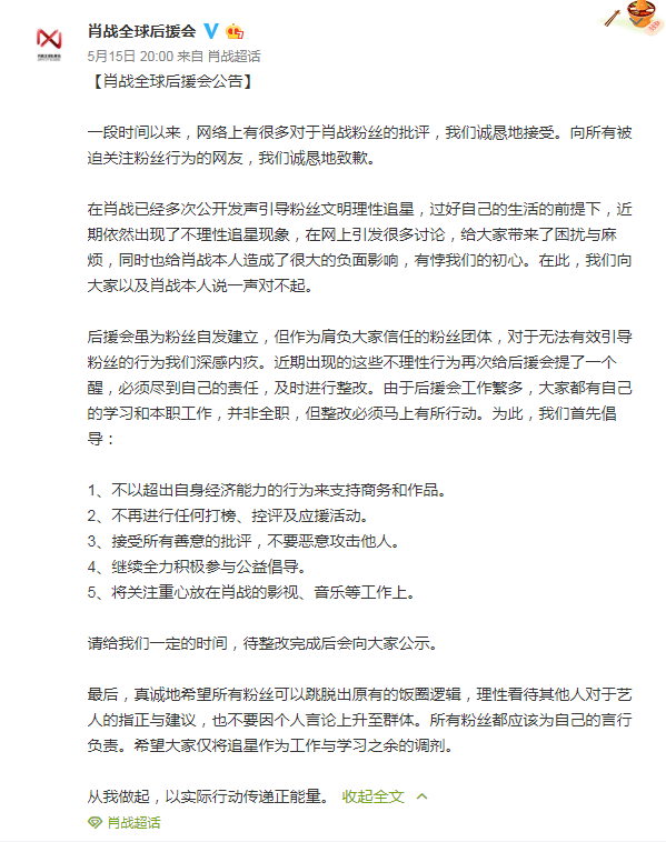 不过,肖战却因粉丝行为而陷入了风波之中,即使如今已时隔近3个月,肖战本人也对此作出了道歉,并呼吁大家要理智追星,肖战全球后援会也发出公告,正确引导粉丝,提出了5点倡导,但是如今的肖战依然遭到了许多网友的抵制。