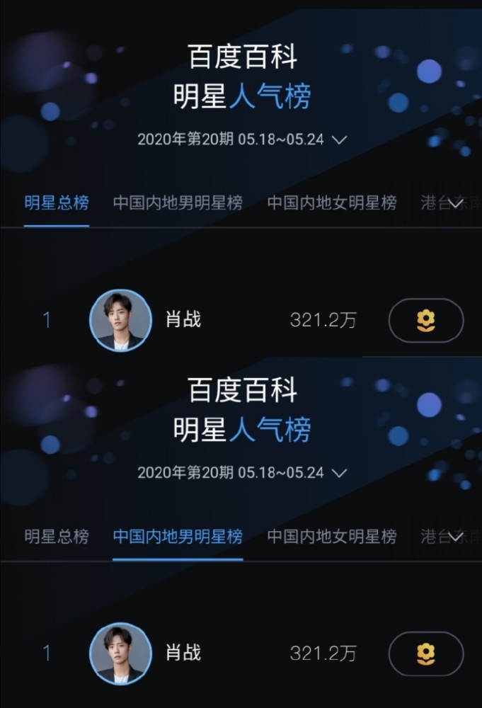 5月25日,有媒体也公布了2020年第20期(5月18日-5月24日)的明星人气榜,肖战再次获得百科明星人气榜新一期“内地男明星榜”和“明星总榜”双榜第一的好成绩,这是他第9次蝉联人气榜榜单的冠军了,连续登顶多次热度不减,人气和实力兼具,依然特别的优秀。