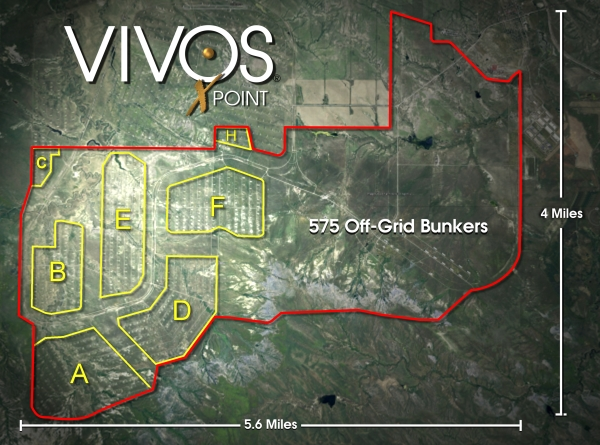 Vivos xPoint之前曾转手农场主,外面看起来就像一个废弃的农场,拥有 575 个坚固的混凝土掩体,周边 100 英里的私人道路提供了进入每个掩体的通道,在视线所及的范围内中恒交错,每个掩体都提供了安全、保护和隐私。沿着天际线,隐藏在草坡上的钢门指示着通往掩体的入口。xPoint 社区里配备有学校、医疗诊所、剧场、花园、健身房和水疗中心,总占地约46.6平方千米(7万亩),据悉是目前地球上最大的生存避难社区。