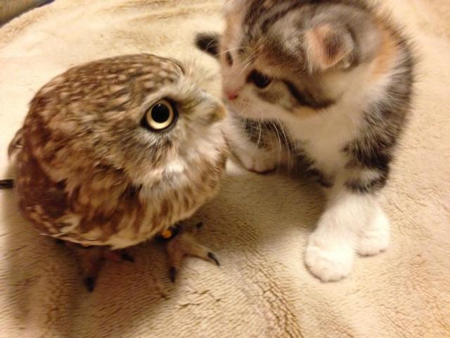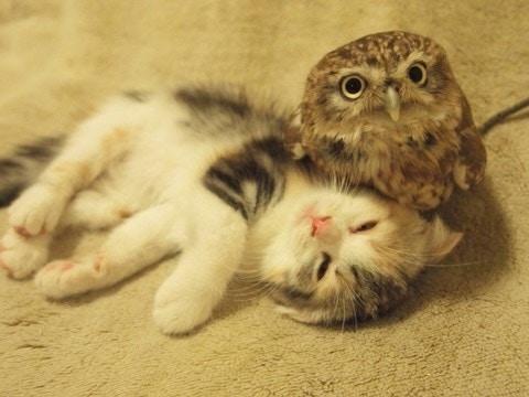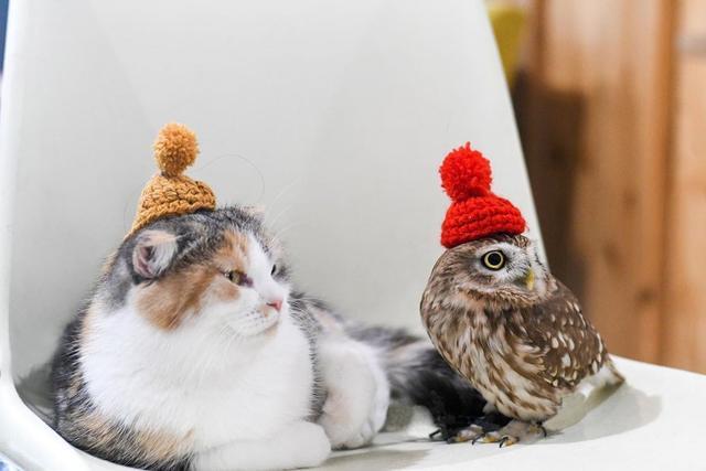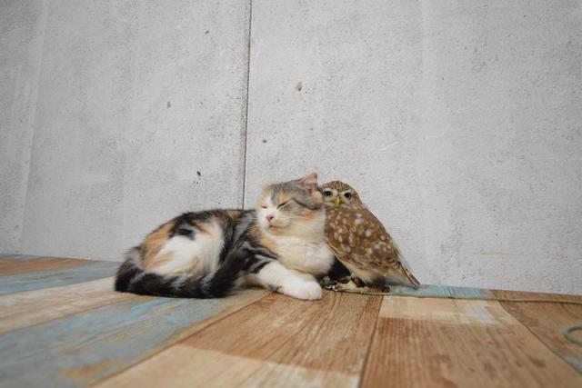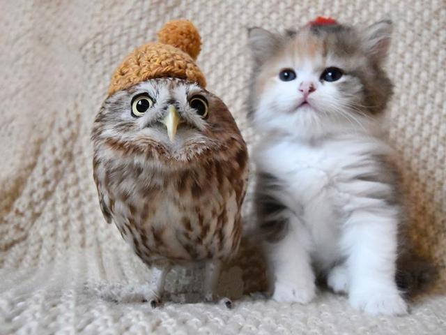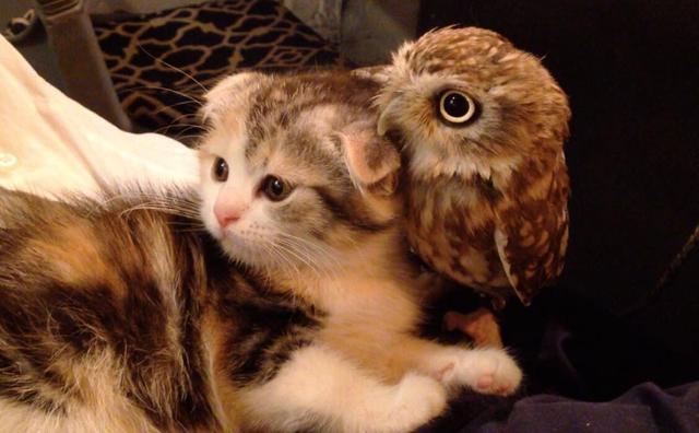 虽然猫头鹰和猫咪都不是一个物种,但呆萌的HUKU并不介意,反而承担起照顾猫咪的职责。