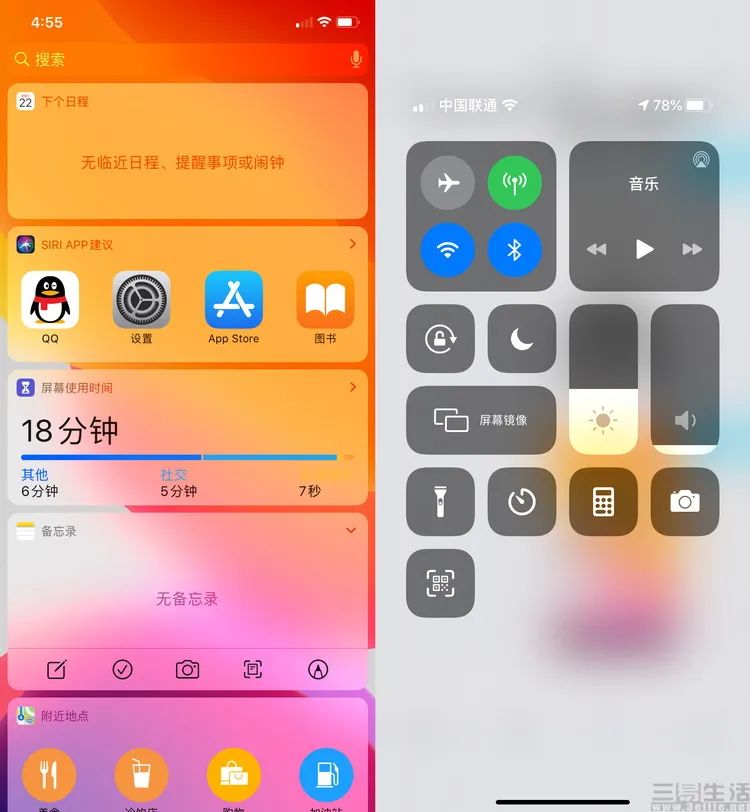 举个简单的例子,为了更清晰直观的展现信息,并且方便用户单手触控操作。如今iOS上的通知栏、快速控制界面,以及负一屏,都是这样的大块大块的半透明图形UI。