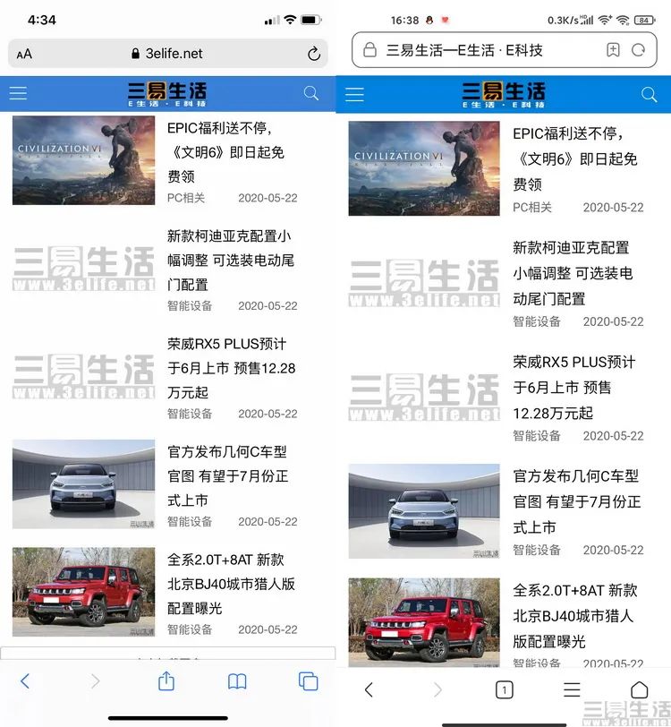 iPhone 11(左)与Android旗舰(右)显示同一个网页