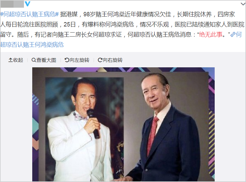 据媒体报道,现年98岁的“赌王”何鸿燊于25日传出病危,虽然其二房长女何超琼在第一时间辟谣称“绝无此事”,但是当晚依旧有大批媒体在医院门口彻夜蹲守以获取最新消息。