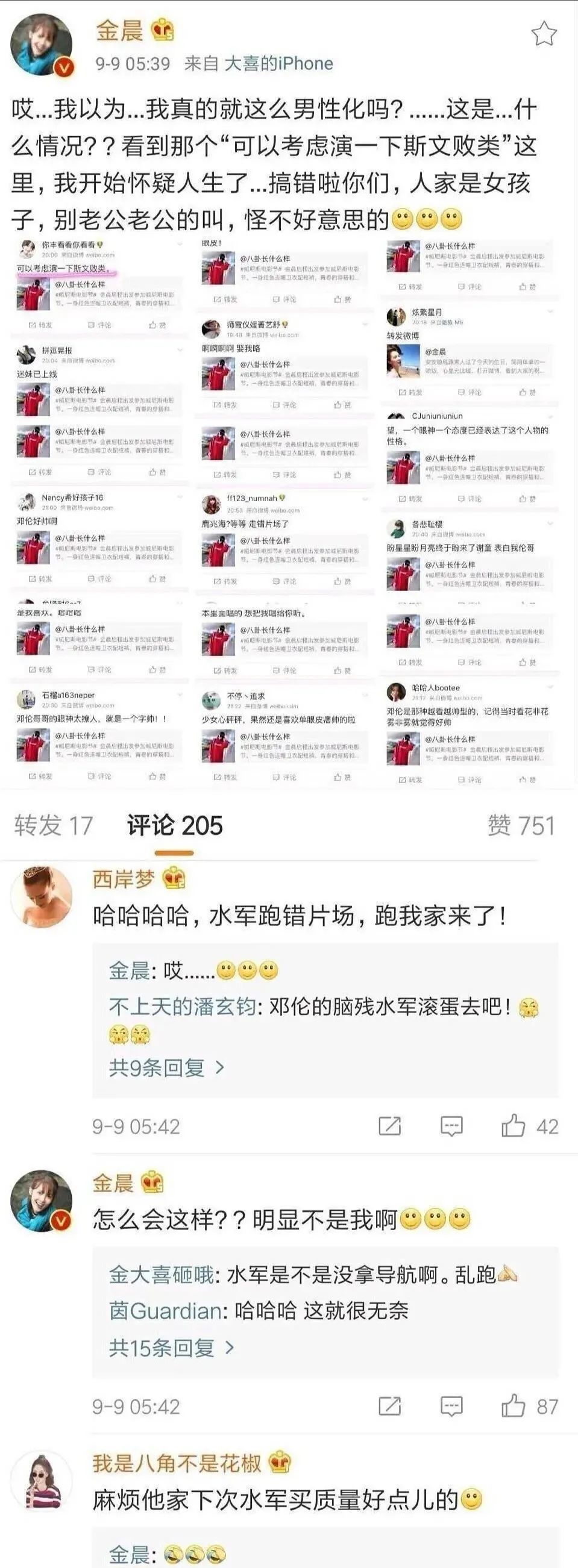 分手后,金晨发文内涵邓伦买水军,嘲笑水军跑错到自己微博来了。