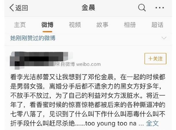 金晨当然也不甘示弱,“手滑”点赞了一篇diss男方的微博。