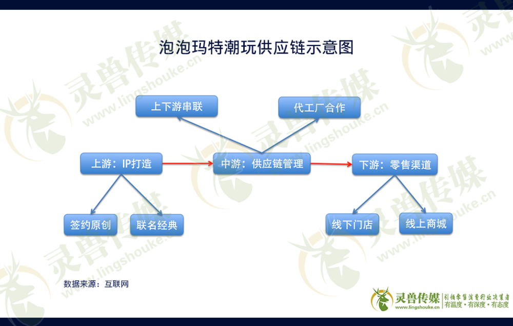 拿泡泡玛特为例,它的产业链涉及上、中、下游,上游签约艺术家开发IP,中游进行供应链管理,不仅需要上下游串联,还要找代工厂进行合作,而下游则是零售渠道。