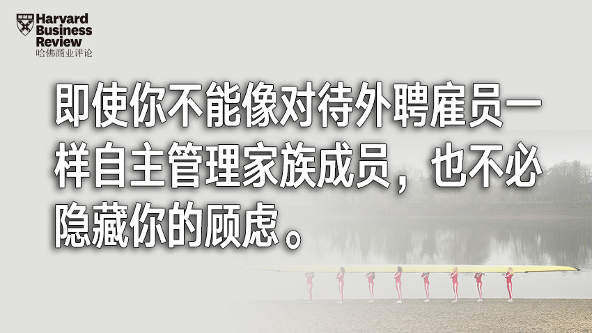 从公开讨论责任制开始。对家族成员表示尊重是好的,但仍有必要坦诚阐述商业需求。在与家族成员的最初谈话中,应深入探究和倾听他们对自己的看法,以及对自身贡献的评估。作为回应,你需要以友善清晰的方式描述自己和其他领导层对他们的期望,在随后的电子邮件中也要重申这些期望并感谢他们参与谈话。将上述内容记录下来,在以后有关绩效的对话中用起来就更容易。