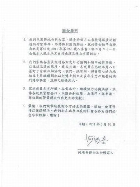 清官难断家务事,但遇上赌王这样的能够影响经济的家族,都必须得出马。2011年3月10日,赌王和家人共同发表声明,表示家事得到圆满解决。