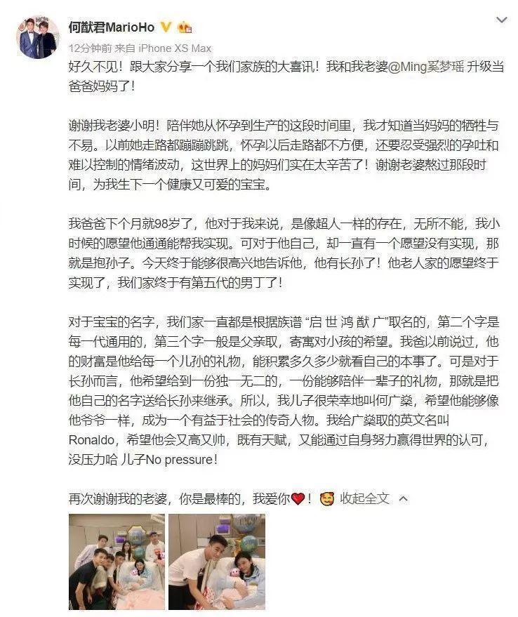 何猷君庆祝老婆生孩子的帖子似乎暴露了原因: