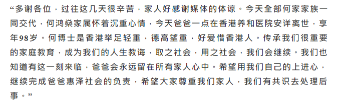 代表家人发言的,是二房长女何超琼,她宣布何鸿燊在香港养和医院安详离世的消息,并说一家人已有共识去处理后事。