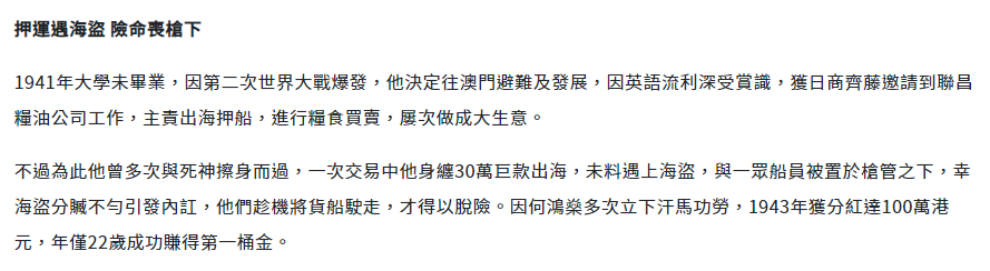 在这特殊岁月里,公司大发战争财,在日本军舰横行的海上从事高危的押船工作,多次和死神擦身而过,但面对险境何鸿燊也能机智逃脱,为公司立下汗马功劳,也由此赚到了第一桶金——获得公司100万分红,一下子成为富豪。