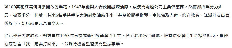 有了财富,这位昔日贵公子想的不是把钱挥霍掉,而是“钱生钱”,选择创业——在澳门创办了煤油公司,结果招来黑帮妒忌,对方发出死亡恐吓,何鸿燊只得结束生意离开澳门。