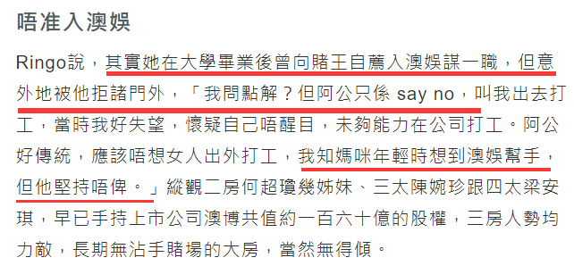 倒是透露了何超英年轻时想进入澳娱,却被何鸿燊拒绝,自己想进去打工也被外公say no。